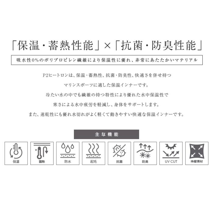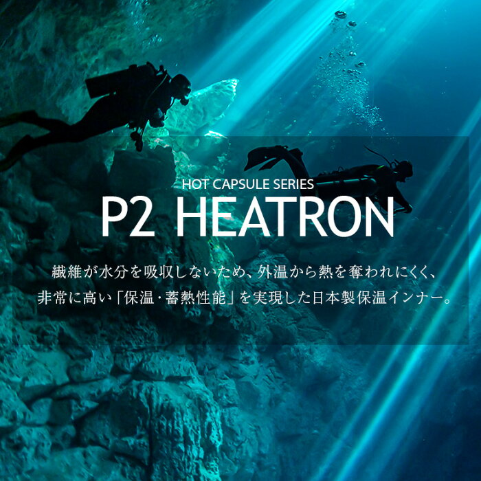 日本製 ショートパンツ パンツ インナーパンツ アンダーパンツ ショーツ レギンス ホットカプセル ホットカプセルシリーズ HOT CAPSULE P2 HEATRON P2ヒートロン ピーツーヒートロン ぴーつーひーとろん 防寒 保温 蓄熱 温熱 蓄熱 防水 断熱効果 ハイネック 日本製 Made in Japan 伸縮 ストレッチ フィット ウェットスーツインナー ドライスーツインナー ダイビングインナー インナーウェア アンダーウェア インナー 冷え予防 冷え対策 ケガ対策 ケガ 寒さ対策 寒さ予防 疲労軽減 クロロプレーンゴム クロロプレンゴム クロロプレーン クロロプレン ネオプレン ラッシュガード サーフィン ダイビング ウィンタースポーツ スキューバダイビング スクーバダイビング フィッシング ヨット 沢登り カヤック 釣り フィッシング マリンスポーツ ウォータースポーツ アウトドア フェス ヨガ スキー スノボ スノーボード バイク 自転車 ジムa 商品説明 「高い保温・蓄熱性能」×「半永久的な抗菌・防臭性能・防汚性」 ポリプロピレン素材で水分を吸収せず*保温性に優れ、非常にあたたかいマテリアル P2ヒートロンは、保温・蓄熱性、抗菌・防臭性、快適さを併せ持つマリンスポーツに適した保温インナーです。