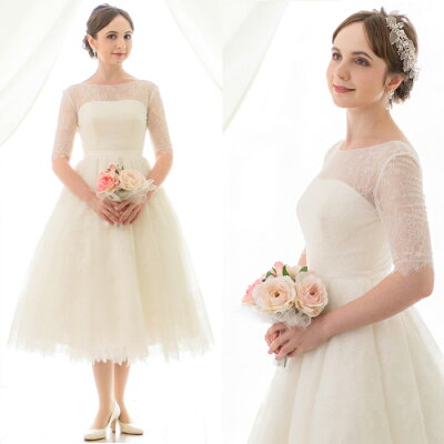 【ロマンティックミモレ丈】【アンティーク風レース】ウエディングドレス ミモレ 二次会 花嫁ドレス 二次会ドレス ミモレ  ミモレ丈 ウェディングミディアム アンクル丈 ミモレ丈 ウェディングドレス