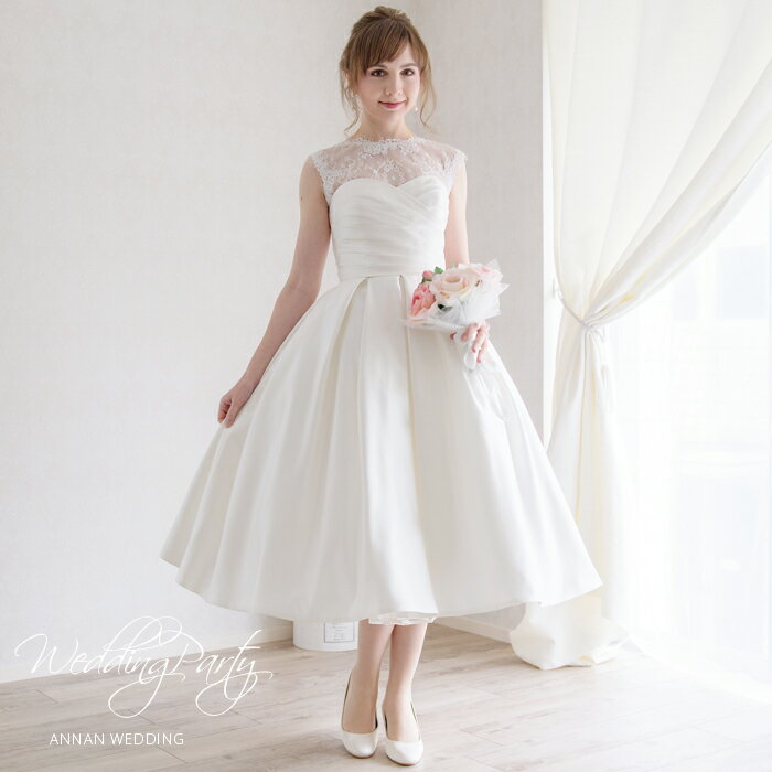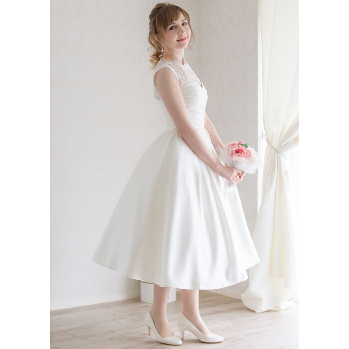 【総サテンの高級感ミモレ】【レトロ可愛い着こなし】ウエディングドレス ミモレ 二次会 花嫁ドレス 二次会ドレス ミモレ ミモレ丈 ウェディングミディアム アンクル丈 ミモレ丈 ウェディングドレス