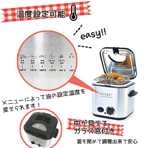 【商品詳細】 サイズ(約): 幅25×奥行き22×高さ19.5cm コード80cm バスケットサイズ: 横幅13×縦幅11.5×深さ7.5cm 材質:PP、ステンレス、PBT 定格電力:100V 50/60Hz 消費電力:800W 温度調節:80〜190° 最大油量:1.2L