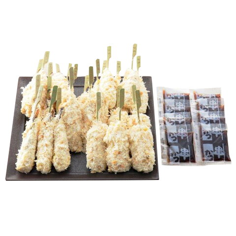 選び抜いた食材5種(豚ヒレ・海老・鶏ねぎ・ほたて・豚ロースチーズ)をそれぞれ串にさし、生パン粉をつけてから急速冷凍をした上で大阪の本社工場から直接ご自宅にお届けいたします。