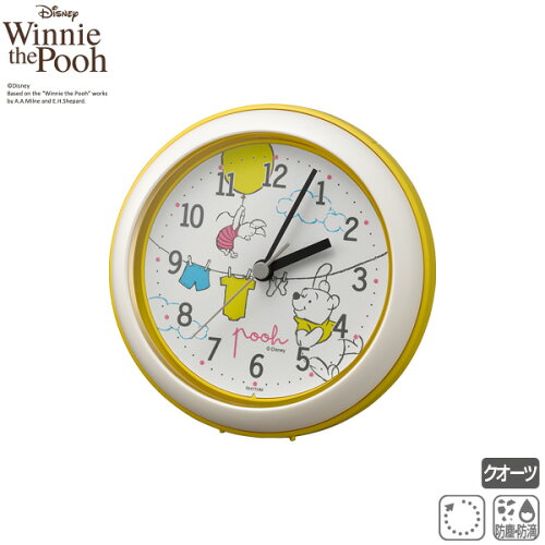 ◆ディズニー くまのプーさん 4KG716MC33 防塵 防滴 ステップ秒針 クオーツ 希望小売価格 オープン価格 枠材 プラスチック枠(ABS/黄色(白)) サイズ・重さ 縦 118x横 118x奥行 48mm/200g 電池 単3マンガン乾電池 x 1 ※電池は付属しておりません 機能 掛・置・吊り下げと多様なシーンに対応! 小振りサイズのバスクロック。